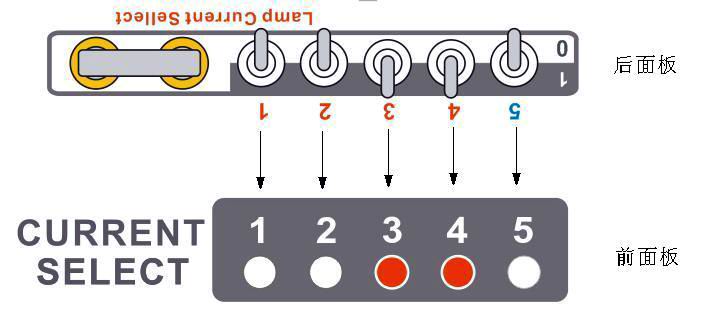 上圖為HST-106E燈管維持電流設(shè)定 開關(guān)的圖形。后面板撥動(dòng)開關(guān),向上 為 1(選中),前面板指示LED點(diǎn)亮,燈管電流增加。向下為 0 (不 選中,LED不亮)。