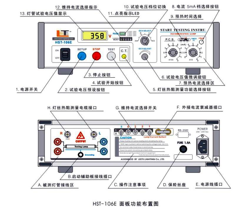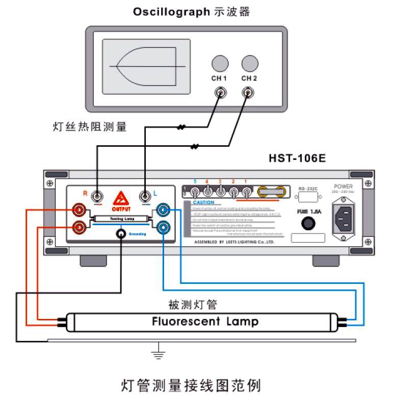 將被測燈管和啟動(dòng)輔助金屬支架,按照HST-106E啟動(dòng)儀背面的 ( OUTPUT ) 被測燈管接線圖進(jìn)行連接。并確認(rèn)各結(jié)點(diǎn)接觸可靠。注意,與燈管連接的各導(dǎo)線長度建議不要超過2米,并注意導(dǎo)線的耐電壓指標(biāo)。