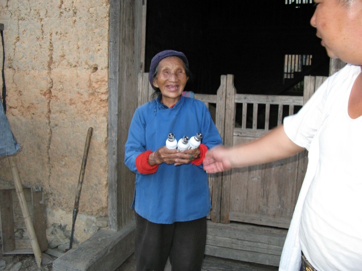 老表雙手接過節(jié)能燈 心里樂滋滋